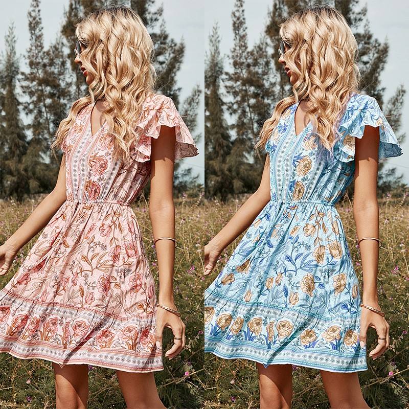 Mini Dress Summer Casual High Waist Bohemian Boho Dress Summer Beach Outfit 2022 Women Short Sleeve V-neck Floral Print Formal
