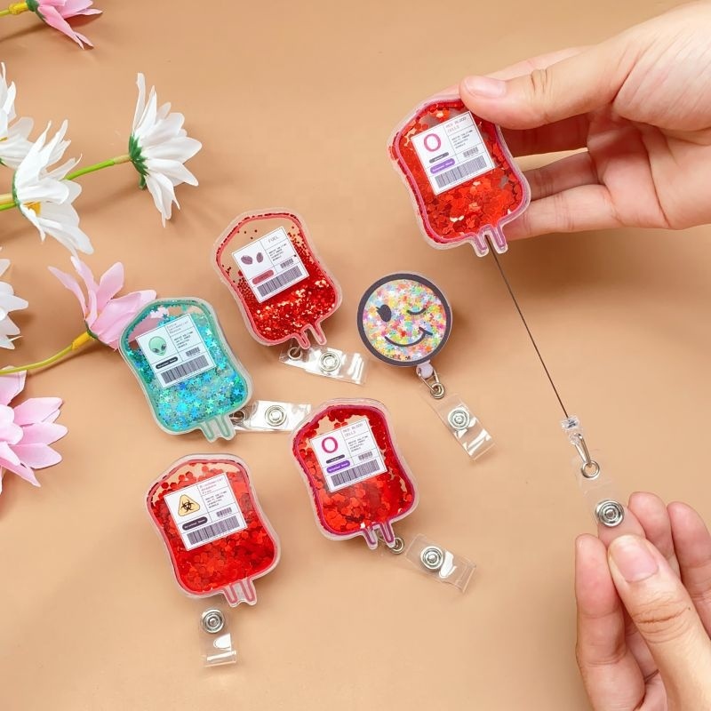 Hot Sale Acrylic Shaker Blood Iv Bag Alien Smile Badge Reel Nurse Accessories Id Card Holder Retractable Badge Reel Badge Holder