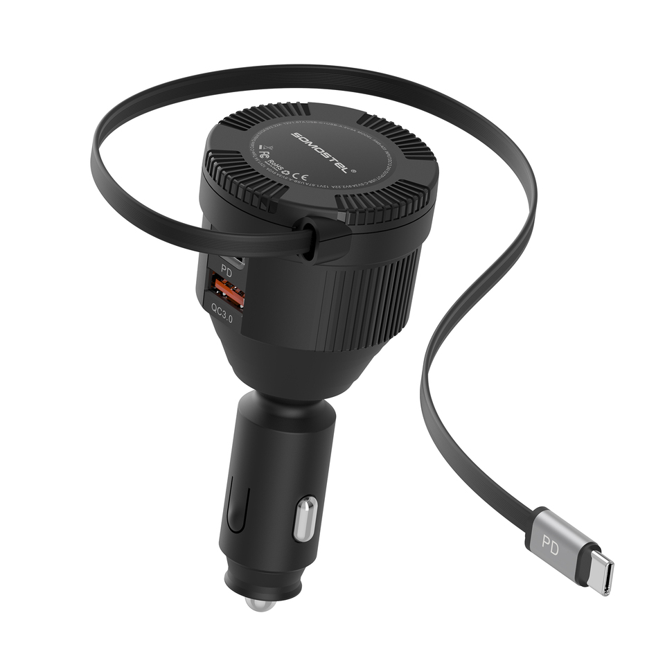 rotatable USB-A and USB C car charger with built-in retractable cable