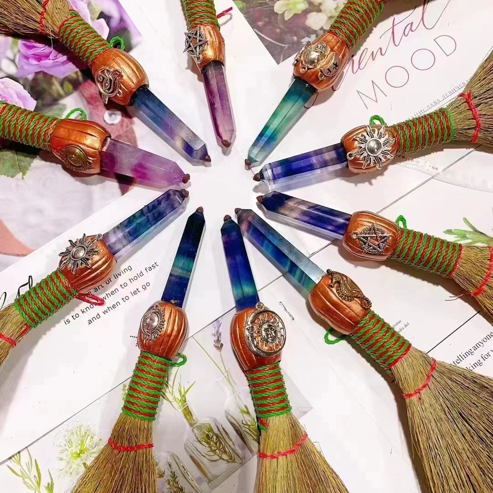 Diy Halloween Scepter Crystal Broom Natural Witch Cane Clear Quartz Witch Broom For Halloween Home Decoration