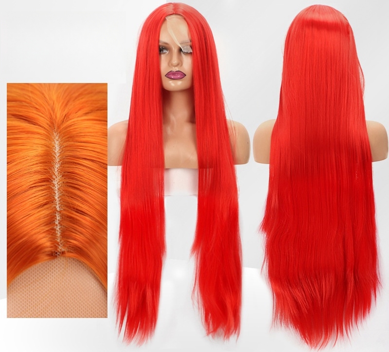 Changge Ruili 40-inch Extra Long Mid Split Straight Orange Wig 13x1 Lace Front Synthetic High Fiber Party 1pc Natural Style