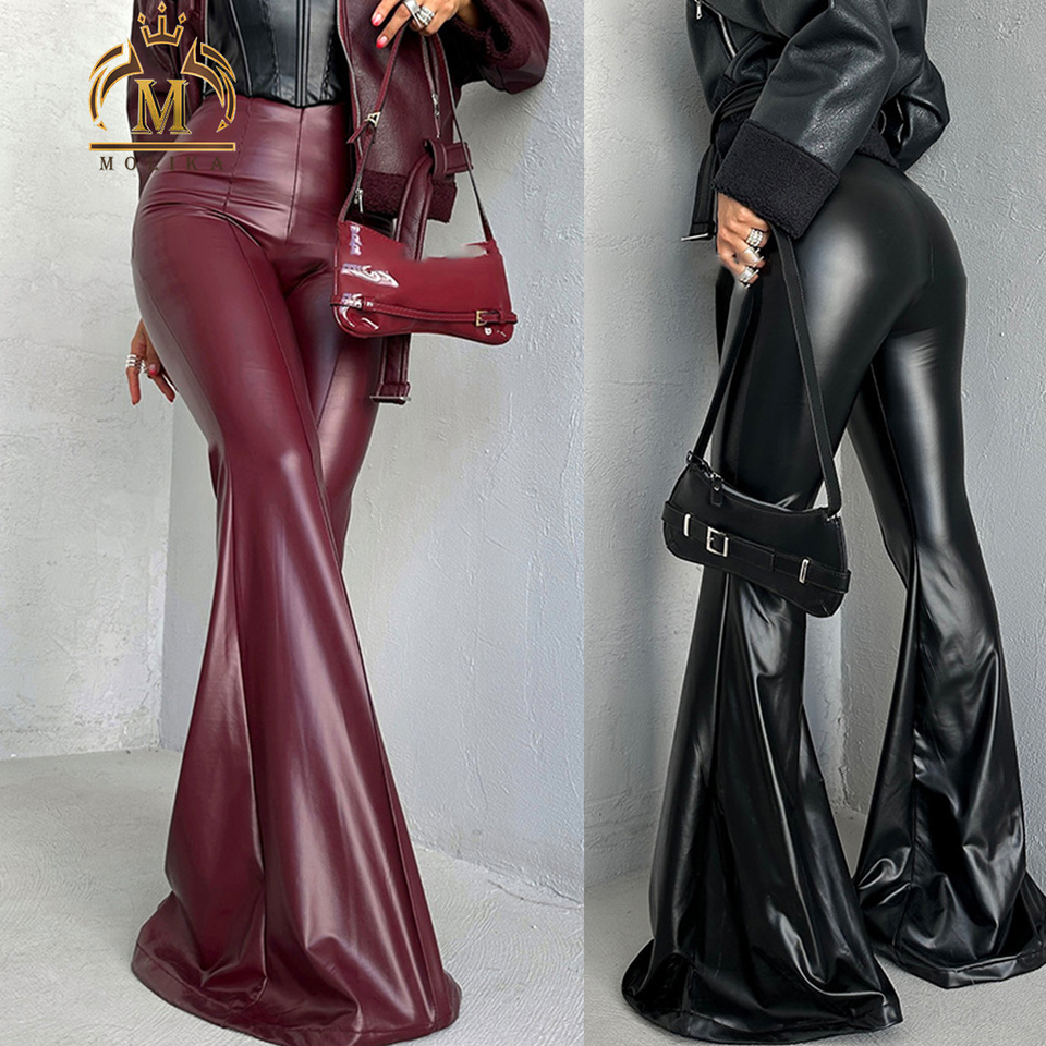 Spring Fall Women Leggings Sexy Stretch Pu Slim Flared Pants Ladies Sexy Women Fit Pu Leather Flared Pants Bottoms Female