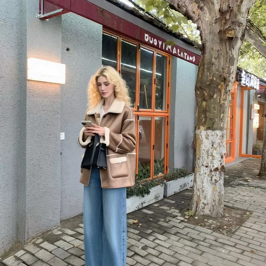 Special Offer & In Stock Wool Lining Leather Jacket Women Vintage Collar Winter Outerwear