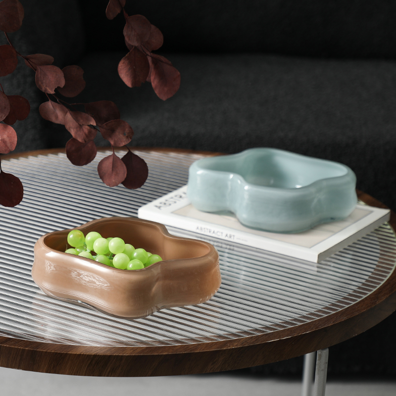 Flolenco Nordic Blue Coffee Glass Petal Plate Handmade Eco-friendly Salad Fruit Tray For Interior Decoration For Home Or Hotel