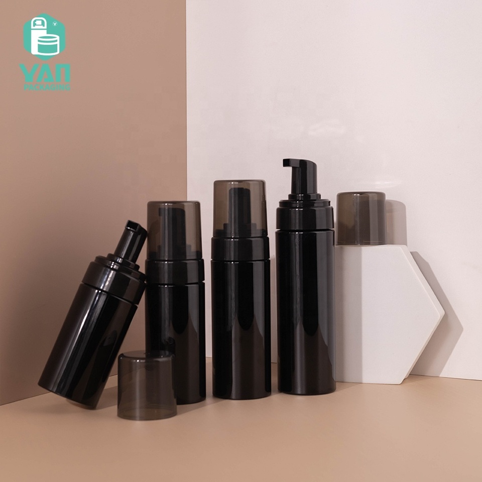 Yan Packaging 100ml-200ml Shiny Black Cylinder Simple Pet Plastic Foaming Pump Bottle Cap Shower Gels Facial Cleansing In Stock