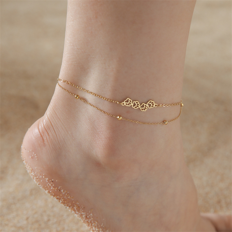 Hot Sale Stainless Steel Double-layer Bead Chain Anklet Cute Animal Dog Paw Charm Anklet For Women