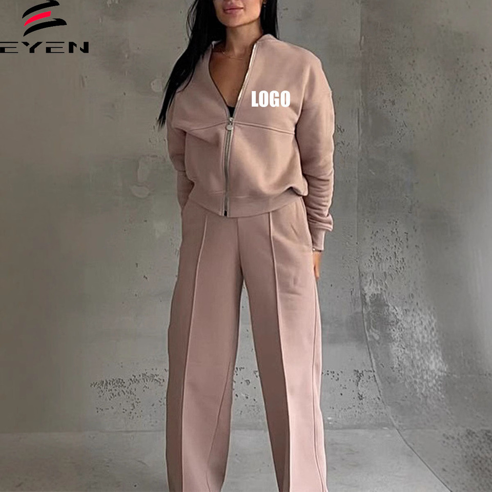 Conyson Hot Sale Fashion Autumn Lady Custom Logo Leisure Clothing Suit Wholesale Zip Solid Cardigan Pants 2pcs Women Clothes Set