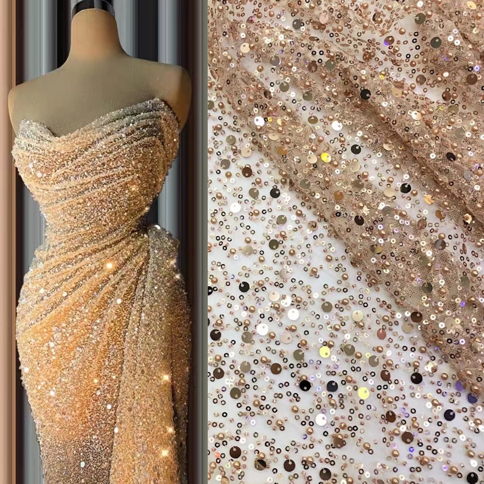 Luxury Crystal Sequins Embroidered Lace Fabric 22 Colors Beaded Pearl Bridal Lace For Evening Dress 5 Yards Moq
